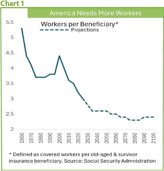 The fiscal benefits are especially clear concerning Social Security. With an aging population and declining fertility rates leading to fewer workers, Social Security benefits are projected to face reductions by 2033.³ Immigration is one of the most effective tools to offset this demographic imbalance, which is caused by an aging native-born population and declining birth rates. The U.S. Census Bureau projects that with lower-than-expected immigration, the population would decline in 20 years, and with zero immigration, it would decline next year, severely harming economic growth.⁴ This outcome would shrink the labor force, erode economic output, and increase fiscal strain on public programs. Immigration is therefore critical to keeping the system solvent and protecting the benefits we all have paid into (Chart1).