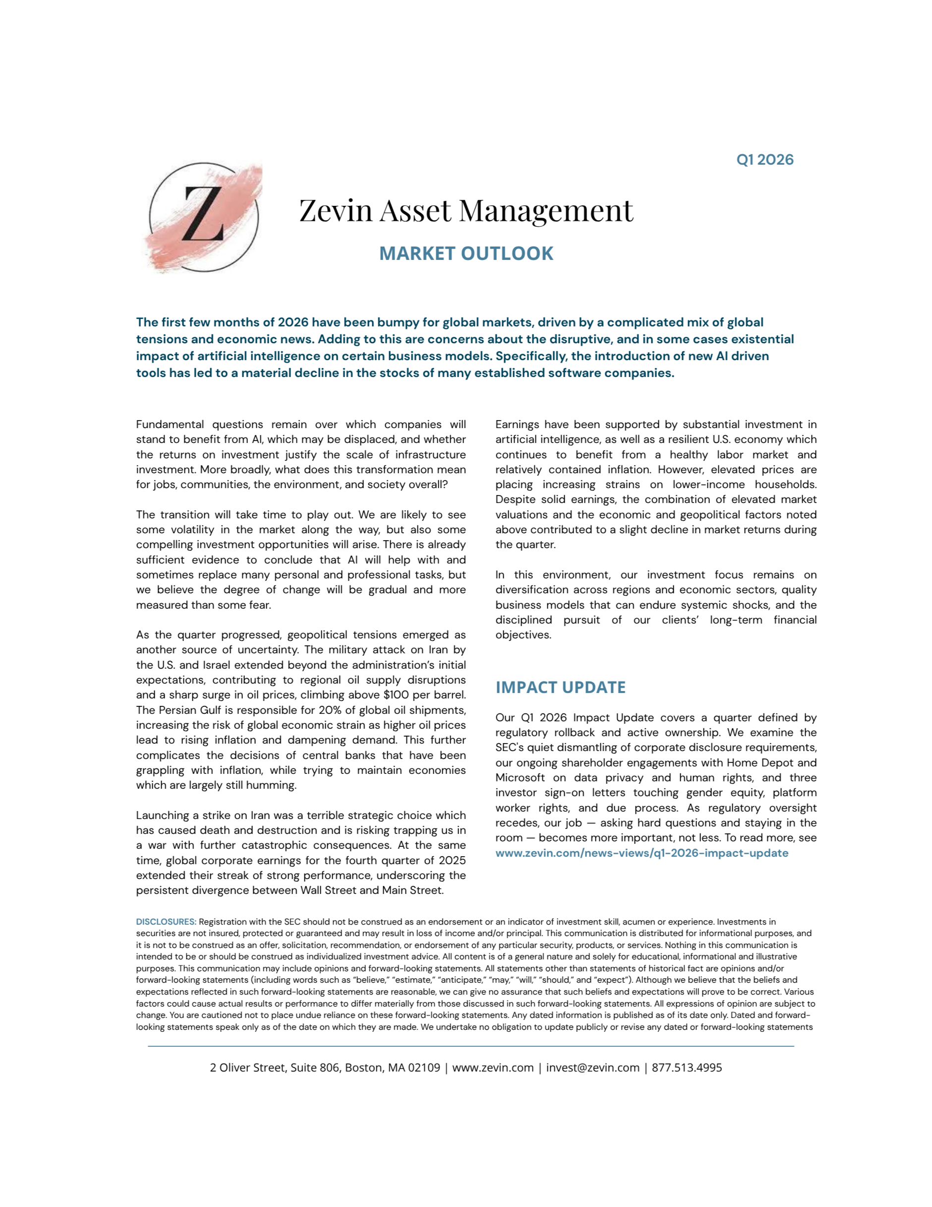Our Q1 2026 Impact Update covers a quarter defined by regulatory rollback and active ownership. We examine the SEC's quiet dismantling of corporate disclosure requirements, our ongoing shareholder engagements with Home Depot and Microsoft on data privacy and human rights, and three investor sign-on letters touching gender equity, platform worker rights, and due process. As regulatory oversight recedes, our job — asking hard questions and staying in the room — becomes more important, not less. To read more, see www.zevin.com/news-views/q1-2026-impact-update