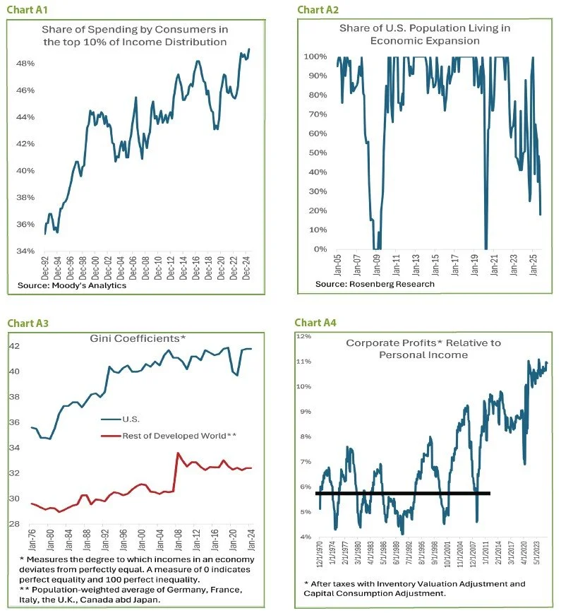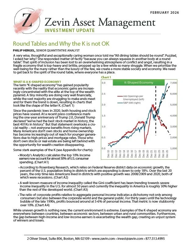 Bottom line: A K-shaped economy is not only unjust, but also economically unsafe. Consumer spending drives GDP growth and it’s dangerous when consumption is concentrated in the few at the top who are dependent on equities to maintain their wealth and confidence. Should equities correct, so too will the willingness to spend. Broadening opportunity and strengthening the bottom of the income scale would result in more inclusive growth, stabilize demand and reduce economic risks. Programs such as guaranteed minimum income, increased tax credits or simply enacting living wage laws would all help in this regard. Shared progress is far superior to concentrated gains. Just as round tables allow for inclusion at the dinner table, which benefits the group, inclusion in wealth gains for everyone benefits the health of the overall economy.