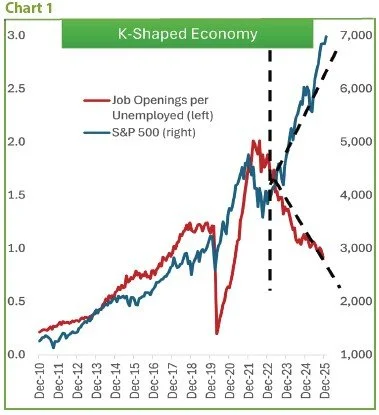 The term “K-shaped economy” has gained popularity recently with the reality that economic gains are increasingly concentrated with the elite at the top of the wealth pyramid. A tiny minority are doing very well financially, while the vast majority are struggling to make ends meet and for them the trend is down, resulting in charts that look like the shape of the letter K. (Chart 1)